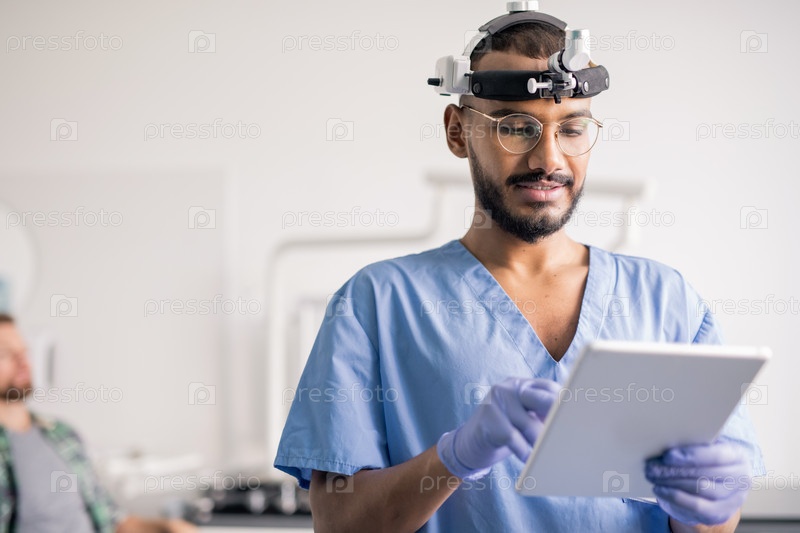 Клиник в форме и медицинском оборудовании на голове прокручивает онлайн-данные