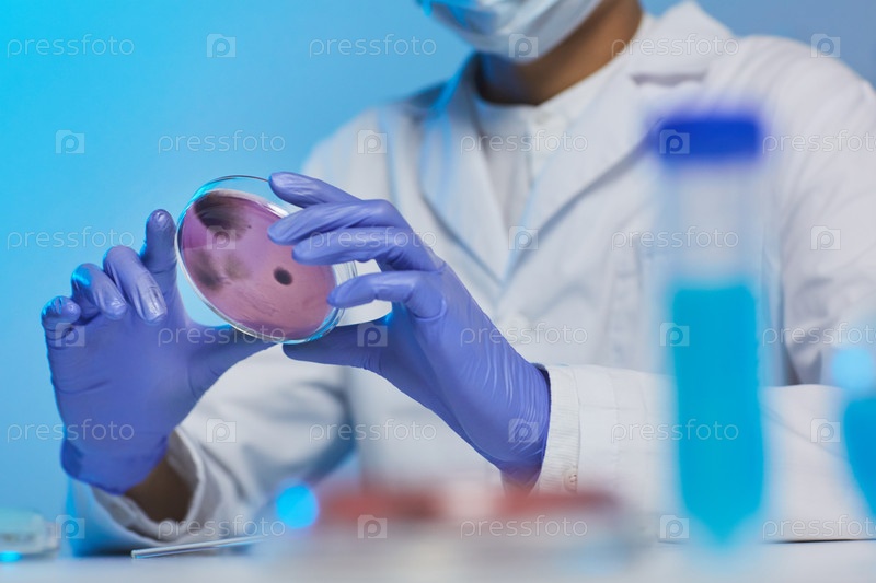 Близкий план неузнаваемого микробиолога в хирургических перчатках, держащего чашу Петри с культурами клеток во время исследования бактерий