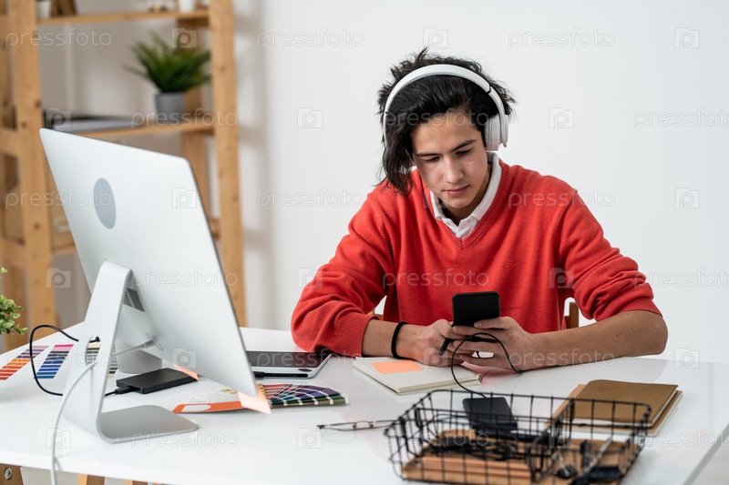 Серьезный парень прокручивает смартфон, слушая музыку на работе