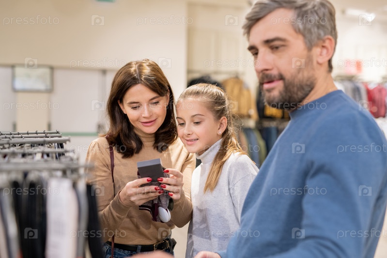 Мать и дочь смотрят на цену теплых вязаных перчаток для зимнего сезона