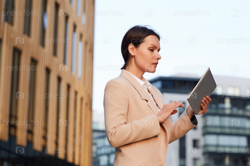 Вдумчивая занятая леди в легком куртке стоит на улице и работает с планшетом, изучая важные файлы