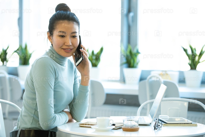 Молодая самоуверенная деловая женщина в повседневной одежде разговаривает со смартфоном в кафе