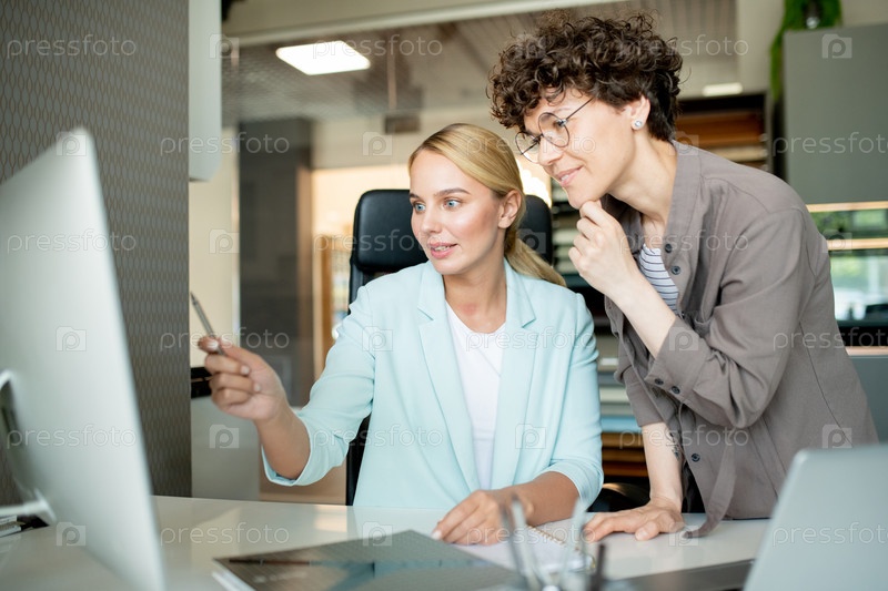Один из молодых дизайнеров объясняет вещи на экране компьютера