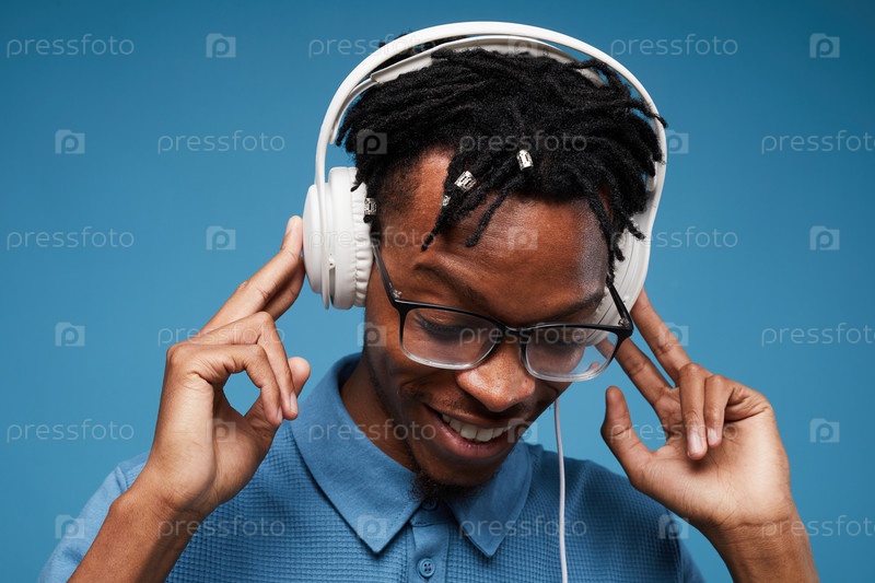 Афроамериканский мужчина слушает музыку на синем
