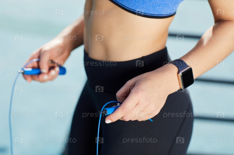 Близкий план неузнаваемой женщины с фитнес-трекером, использующей скаковую веревку для кардиотренингов на свежем воздухе