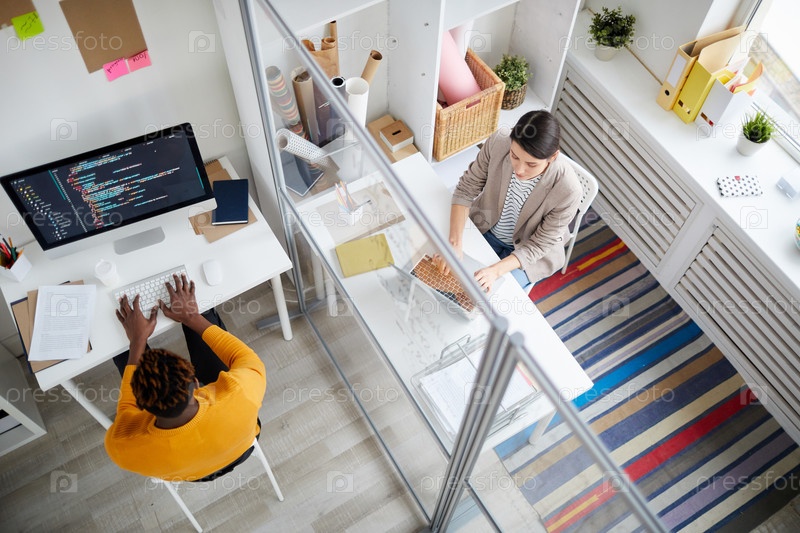 Прямо сверху вид на занятых молодых мультиэтнических программистов в повседневной одежде, сидящих за столами и кодирующих информацию на компьютерах