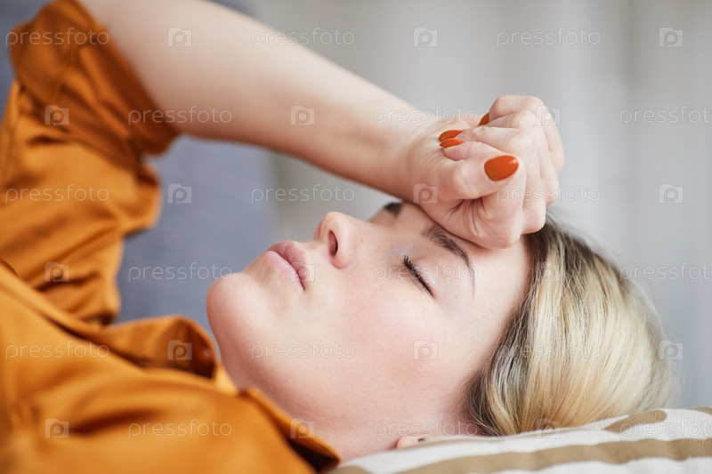 Близкий план уставшей молодой женщины с закрытыми глазами, держащей руку на лбу, пытаясь уснуть