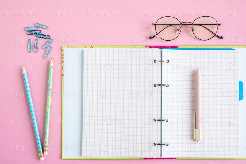 Открытый копирайтер с пустыми страницами, ручка, два карандаша, клипы и очки