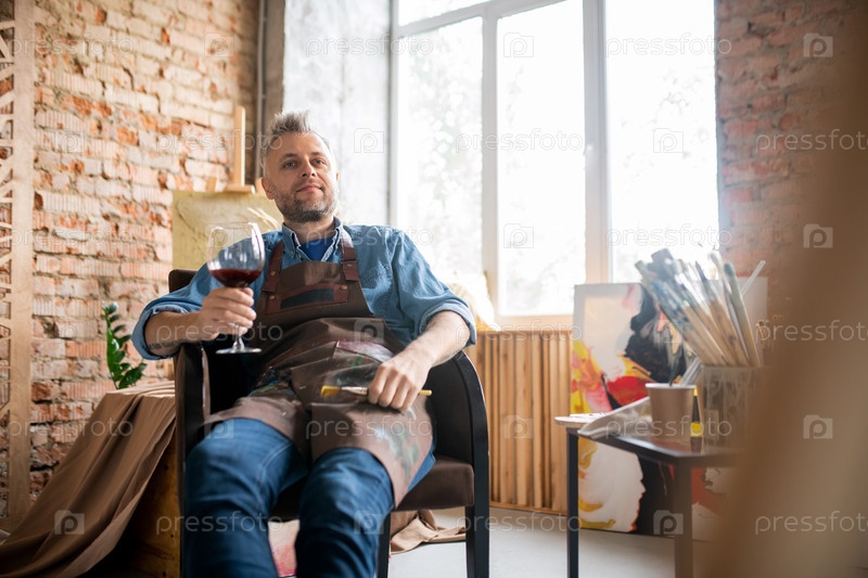 Удовлетворенный художник в рабочей одежде пьет бокал красного вина, наслаждаясь перерывом