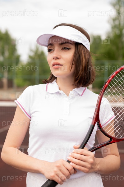 Красивая молодая брюнетка игрок в теннис с ракетой