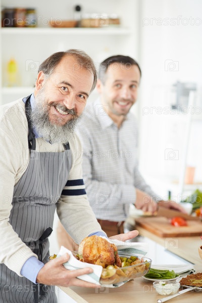 Старший мужчина готовит индейку дома