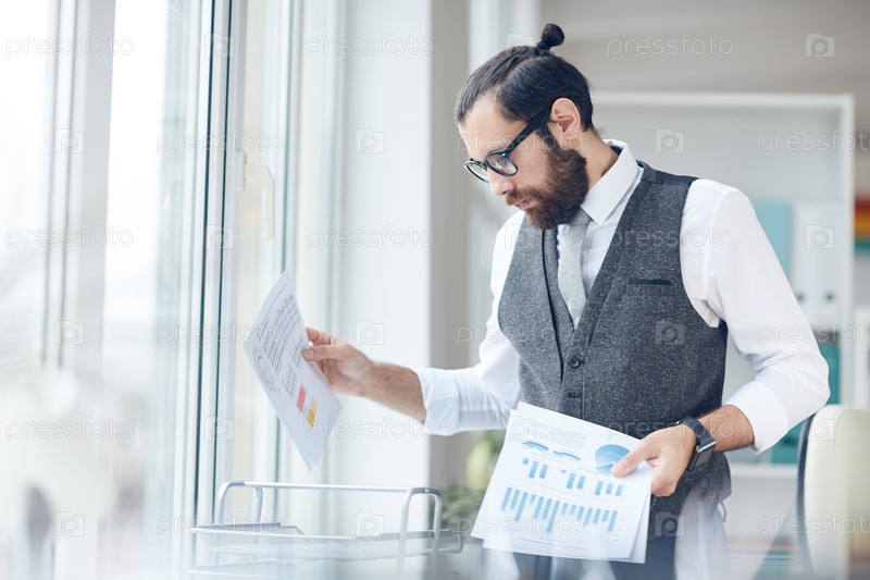 Серьезный занятый модный бородатый менеджер стоит за столом с держателем файлов и находит деловые бумаги в офисе