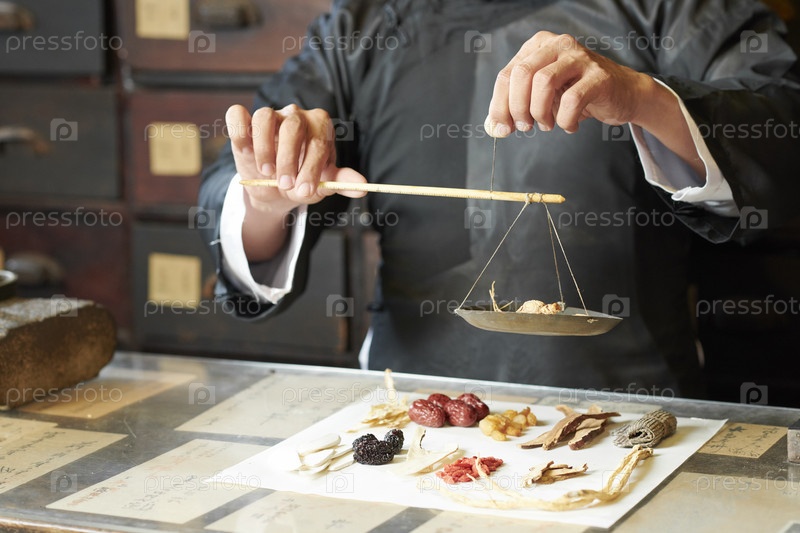Практикующий врач взвешивает сухие корни растений