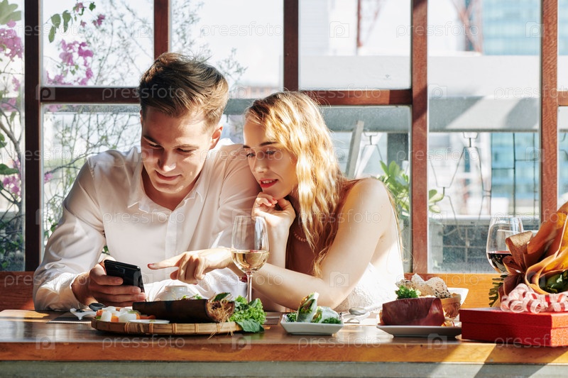 Пара, использующая телефон во время ужина