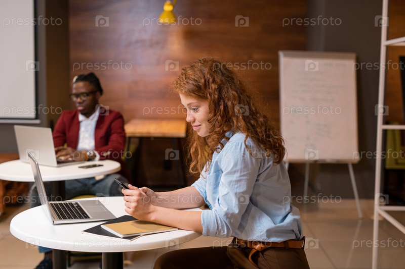 Красивая молодая случайная женщина со смартфоном, отправляющая текстовые сообщения в кафе колледжа у стола