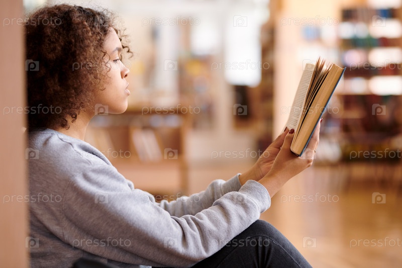 Довольно молодая студентка смешанной расы в повседневном пуловере, читающая книгу