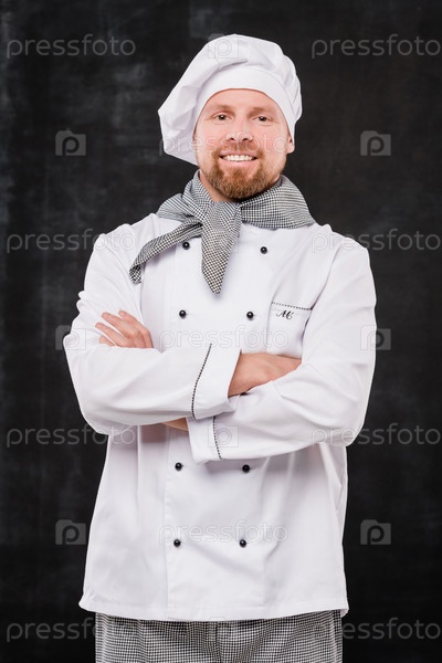 Молодой улыбающийся мужской шеф-повар скрещивает руки за грудь, глядя на тебя