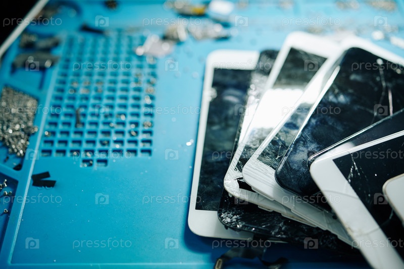 Разбитые экраны смартфонов на столе