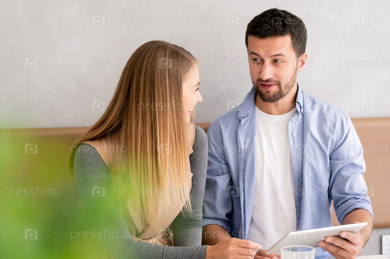 Два молодых современных менеджера обсуждают рабочие моменты на встрече
