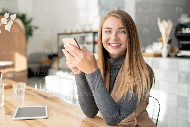 Красивая девушка с зубчатой улыбкой смотрит на тебя, когда пишешь сообщения со смартфона