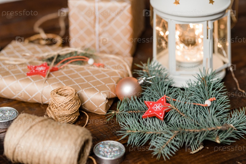 Игловидное дерево с украшением звездой, упакованные коробки для подарков, нитки, свечи и фонарь