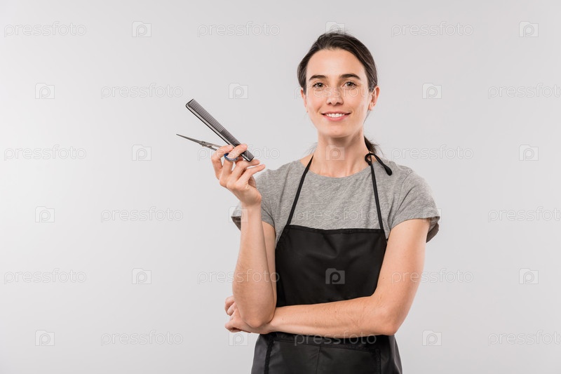 Красивая молодая профессиональная парикмахерша с щеткой и ножницами