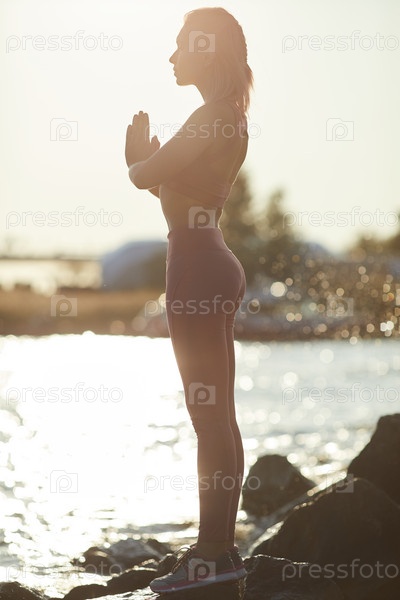 Женщина медитирует возле воды