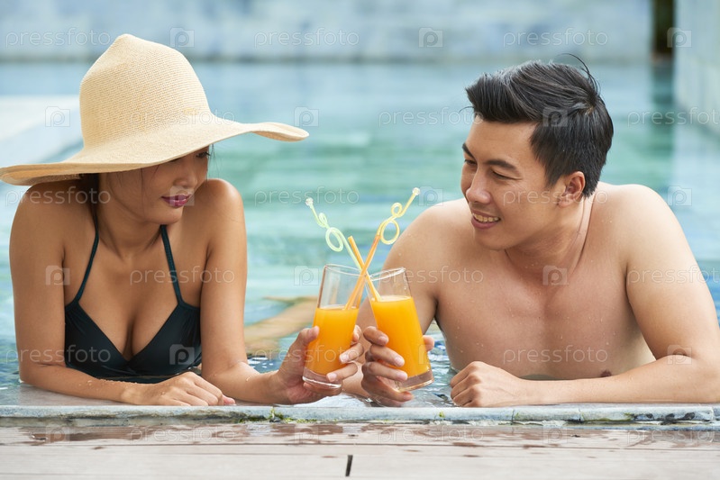 Азиатская пара отдыхает в бассейне