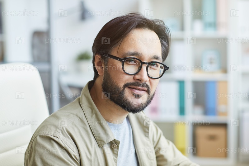 Портрет содержания Красивый молодой бородатый азиатский парень в очках, работающий в современном офисе
