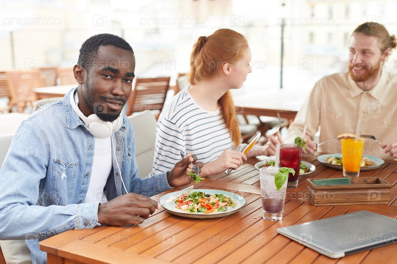 Мужчина с друзьями ест в кафе