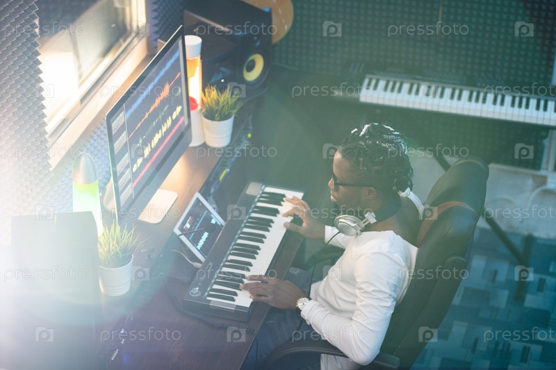 Молодой африканский музыкант в повседневной одежде смотрит на компьютерный экран по месту работы