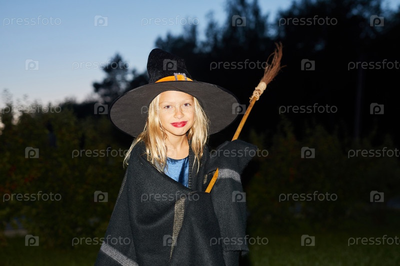 Маленькая ведьма, позирующая в темноте на Хэллоуин