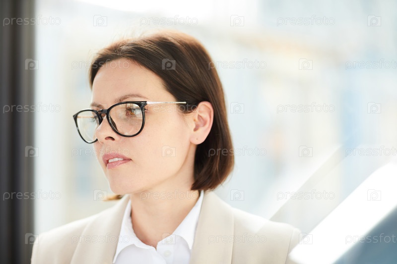 Близкий план задумчивой привлекательной умной бизнес-леди в очках, рассматривающей идеи проектов в офисе