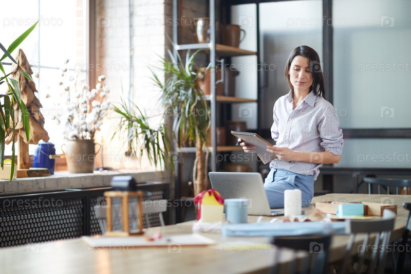 Серьезная занятая молодая предпринимательница в обычной рубашке сидит за столом и держит блокнот, анализируя продажи на ноутбуке в собственной мастерской