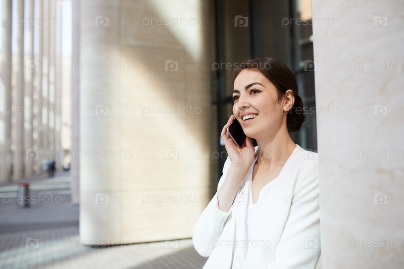 Улыбающаяся деловая женщина, разговаривающая по телефону