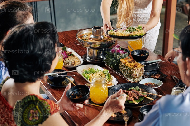 Большая семья ест праздничный ужин