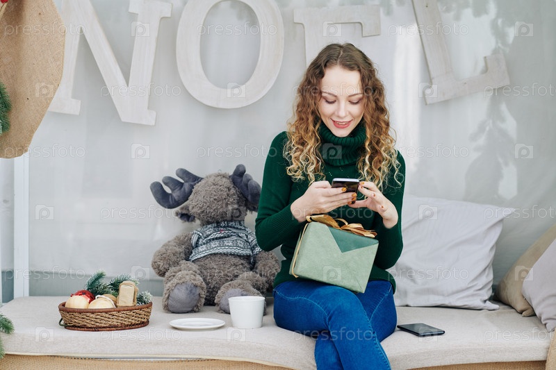 Женщина, отправляющая текстовые сообщения в канун Рождества