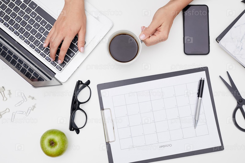 Верхний вид неузнаваемой женщины с нежным маникюром редактирует онлайн-файл на ноутбуке и пьет черный кофе