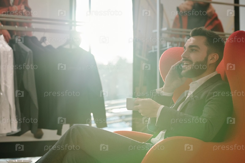 Молодой элегантный бизнесмен с чашкой чая разговаривает с клиентом по мобильному телефону