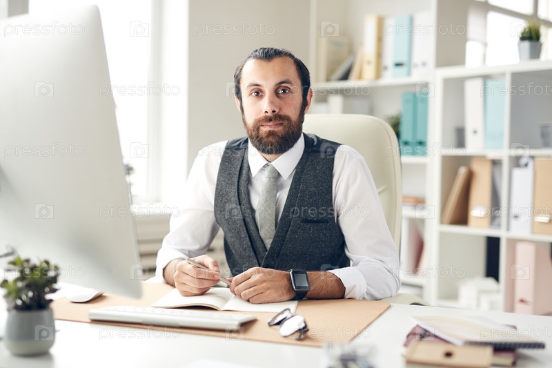 Портрет содержания уверенный в себе модный молодой бизнесмен с бородой, сидящий за столом с компьютером и крутящейся ручкой в руках