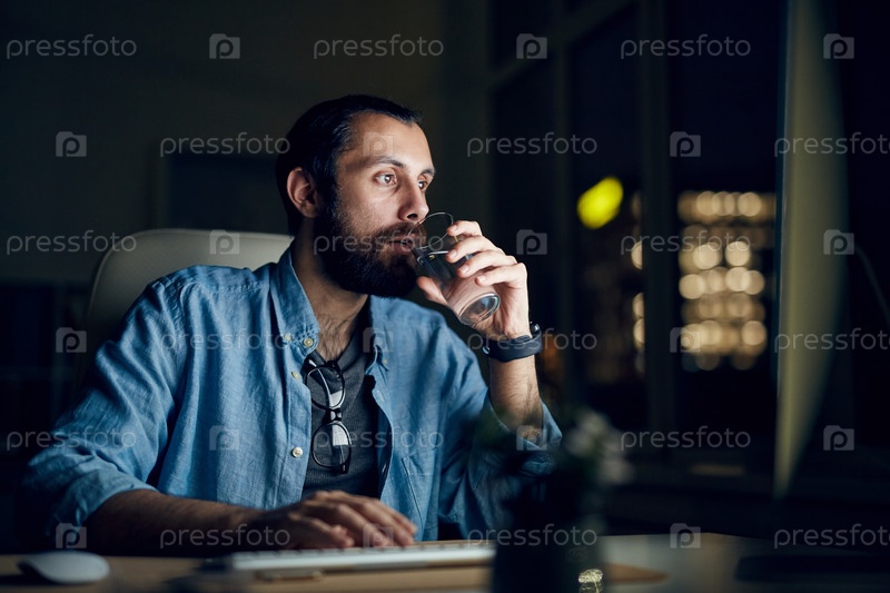 Серьезный, внимательный молодой бородатый мужчина в неформальной рубашке сидит в ночном офисе и пьет воду во время работы с компьютером