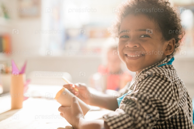 Веселый школьник с прокрученной бумагой сидит за столом, делая украшения