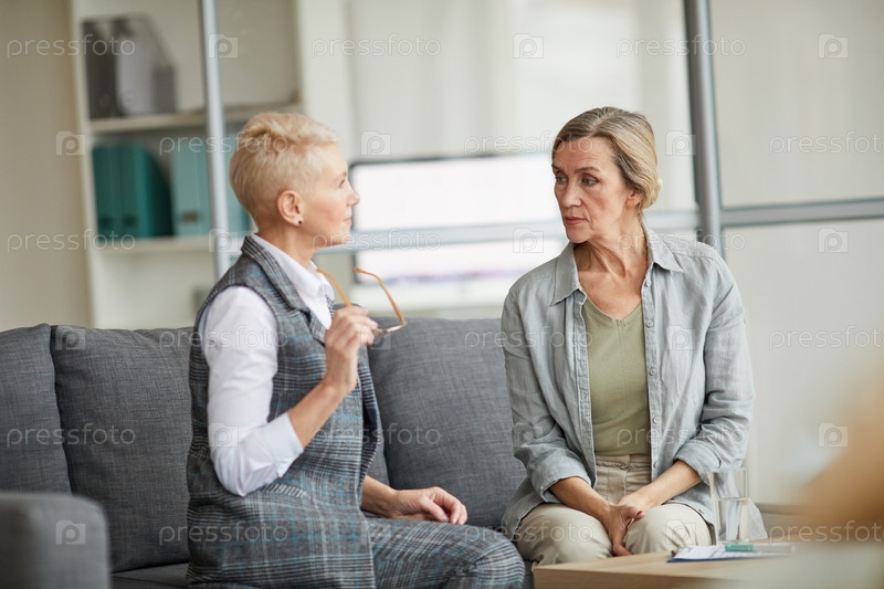 Психолог-женщина консультирует зрелую женщину на сессии терапии