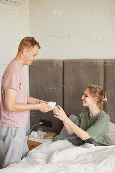 Молодой человек приносит чашку чая или кофе своей больной жене в постель