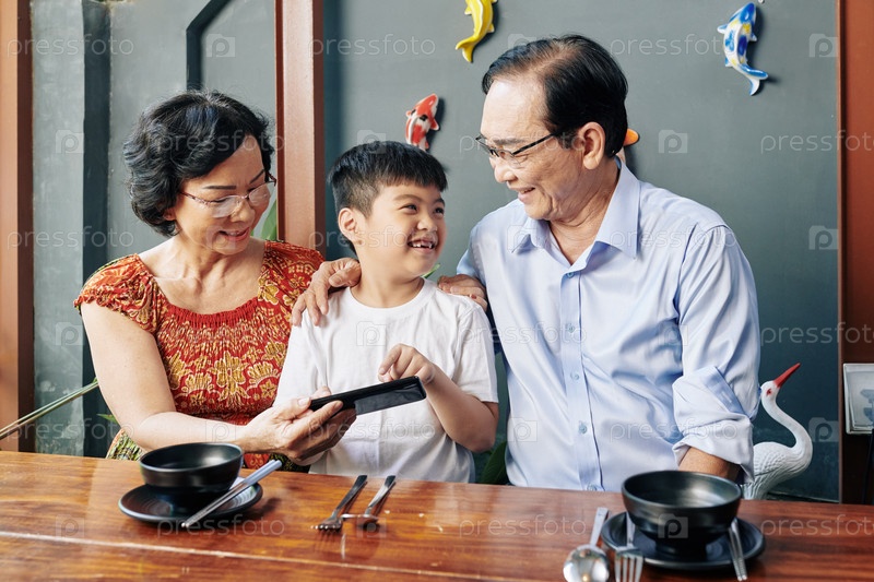 Веселый мальчик в кафе с бабушкой и дедушкой