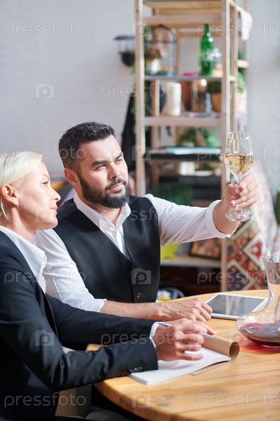 Два коллеги консультируются о характеристиках одного из образцов вина