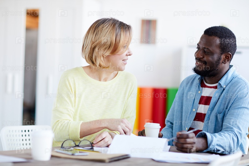 Улыбающиеся многонациональные коллеги в повседневной одежде, сидящие за столом и просматривающие отчет о продажах во время обсуждения стратегии