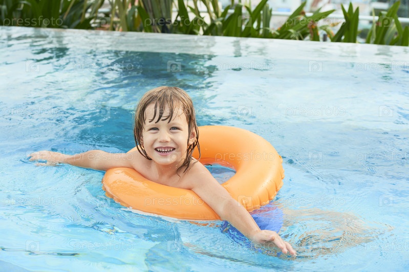 Мальчик учится плавать в бассейне