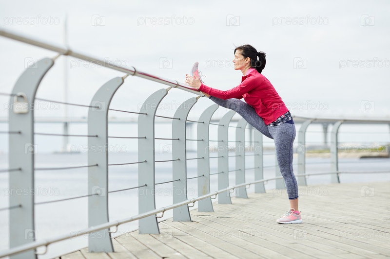 Активная женщина, растягивающаяся на пирсе