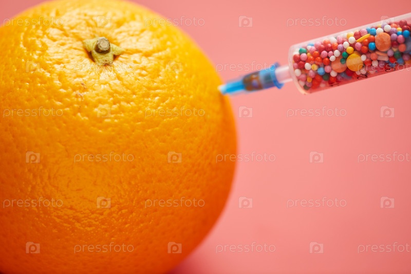 Заместитель сахара: крупный план инъекции сладких посыпок в свежий апельсин с помощью медицинского шприца